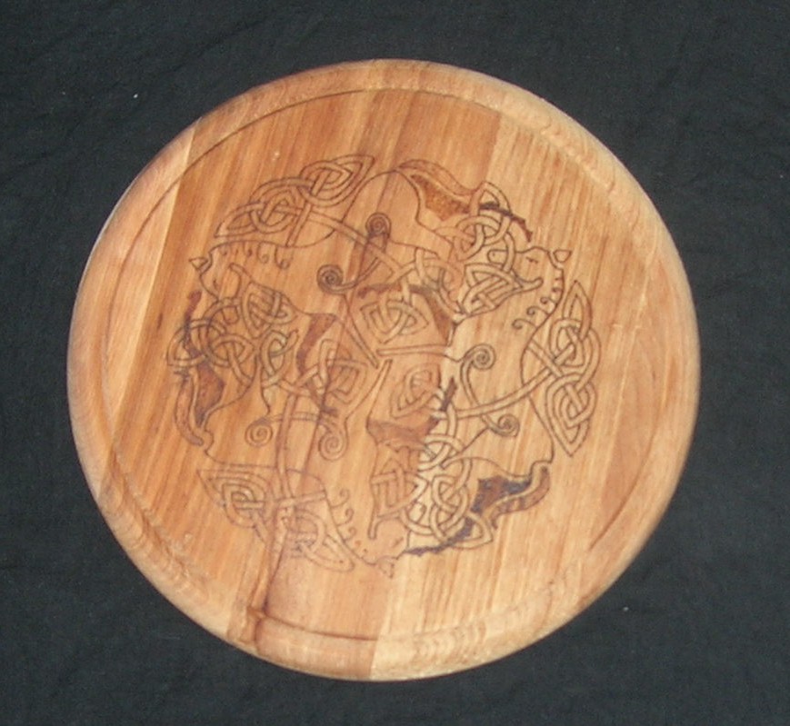Zum Phönixcamp werde ich diese Rhiannon-Altarplatte mit bringen. Das abgebildete Motiv ist ursprünglich von dem Künstler George Bain entwickelt worden. Es handelt sich dabei um eine Pferdedarstellung, die er auf einem piktischen Stein gefunden hat. Er hat sie kopiert und künstlerisch in einen neuen Rahmen gesetzt. Ich habe das Motiv kopiert und mit einigen kleinen eigenen Elementen versehen. Dann habe ich es vergrößert und auf die Holzplatte übertragen, schließlich wurde es – in aufwändiger Kleinstarbeit – auf die Platte gebrannt. Das Kopieren des Motives ist im übrigen voll und ganz in George Bains Sinn, der sich gewünscht hat, dass die keltische Kunst weiter lebt und der – in meinen Augen – das bis heute beste Buch über keltische Kunst veröffentlicht hat: Celtic Art – the methods of construction