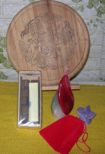 Ein Paket handgemachter Badeschokolade, eine kleine Pentagrammkerze, eine farbige Flammenkerze und ein geheimnisvoller, magischer Beutel mit zauberhaftem Inhalt…