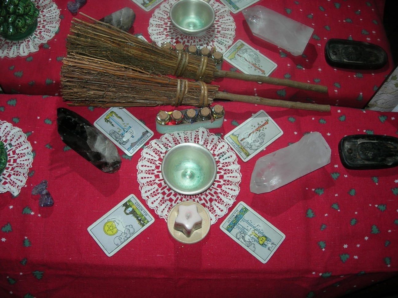 So komme ich zu dem Schluß, dass der Begriff ‚Altar‘ sehr weit gefächert werden kann. Auch die Tendenz neuzeitlicher Hexen, auf ihren Altären nicht nur Götter, sondern auch Hausgeister, Tiere oder sogar Filmfiguren zu ehren ist nicht auf die westliche Kultur beschränkt. In der Mongolei habe ich Hausaltäre gesehen, auf denen unter anderem Bilder von Sportlern der Region gestanden haben. Sowohl Sportler als auch Musiker sind in der Mongolei hoch verehrt und es ist selbstverständlich ihnen am Altar gutes zu wünschen oder aber auch zu hoffen, dass ein Teil ihrer Kraft einen selbst beflügelt.