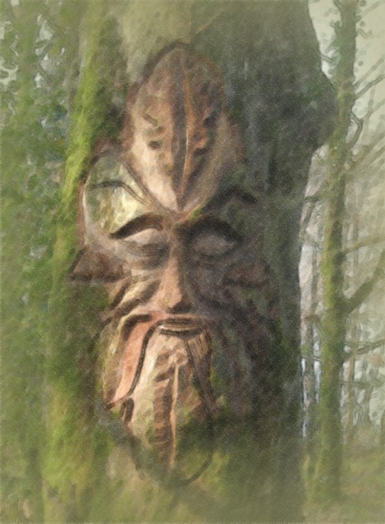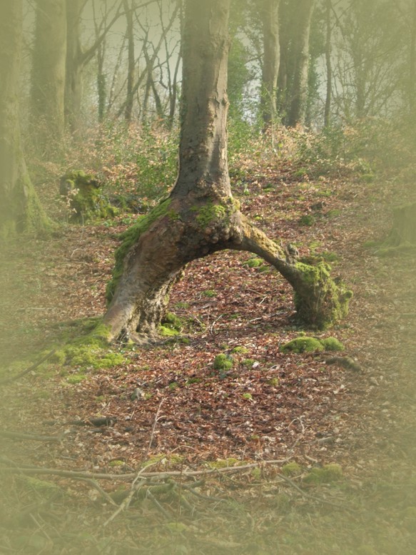 Man spürt die Veränderung der Atmosphäre noch, bevor man hört, dass sich jemand nähert. Als ich mich umdrehe sehe ich, dass es drei Hunde sind und die Lady des Landes, die sich auf uns zu bewegen. Fröhlich und freundlich begrüßen uns die Hunde, die Lady, ihr Name ist Sue, sagt ‚Hallo‘. Und ehe wir uns versehen befinden wir uns in einem kleinen Smalltalk über die Gegend und das Angeln. Sue Lady Kilbracken erlaubt nur ausgewählten Anglern auf ihrem Land zu fischen. Das Jagen ist ganz untersagt. Sie hatte in der Vergangenheit Probleme mit fahrlässigen, unfreundlichen und naturschädigenden Menschen. Doch Angler, die von Hans, wo wir wohnen, kommen sind bei ihr stets willkommen. Denn sie weiß, dass bei Hans nur Naturfreunde unter kommen. Kurzerhand läd sie uns ein zu einem Spaziergang, um uns einen kleinen Angelplatz zu zeigen, an dem es sich gut fischen lässt. Wir nehmen die Einladung an und wandern mit ihr los. Vergessen ist die St. Patrick’s Parade in Killeshandra. Das schöne Wetter kitzelt auf der Haut und lockt einen regelrecht in den Wald. Und dann scheint es, als würde Sue etwas einfallen. Sie weicht vom Weg ab, geht hinein in den Wald und weist uns an ihr zu folgen. Sie wolle uns jemanden vorstellen. Mit einem Male dann stehen wir vor ihm, mitten im Wald lächelt er uns entgegen. „The Green Man“, entfährt es mir, freudig überrascht. Und erstaunt sieht mich Sue an, verwundert, dass ich den freundlichen Baummann kenne. Ich gestehe ihr, dass ich ihn schon lange kenne, ihm aber hier noch nicht begegnet sei. Hingegen ein paar Feen, die hier leben, habe ich schon gesehen. Vor allem die, ‚an der kleinen Brücke‘. Hier lebt eine Fee, der ich bereits 1991 begegnet bin und deren Anwesenheit ich stets als sehr angenehm empfinde. So berichte ich Sue. Und sie strahlt mich an und gibt mir einen Hinweis, wo ich den Feenkreis finde, an dem sie sich treffen. Den hatte ich, in der Tat, noch nicht selbst gefunden, denn er ist gut verborgen. Ein paar Wegweiser in der Natur könnten mir den Weg zeigen, so die Wesen der Anderswelt es wollen. Ich bin ganz aufgeregt und würde am liebsten gleich los gehen, aber zunächst geht es weiter, wir suchen noch einen Angelpatz auf. Und auch hier gibt es einen Koboldsitz und der ortsansässige Kobold erlaubt uns auch ein Foto.
