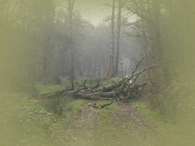 Unser Ziel ist eine kleine Feenbrücke, die ich sehr liebe. Sie führt uns über den Einlauf des hier liegenden Sees auf eine Wiese, auf der das satte Grün schon jetzt lockt. Von hier aus kann man die Luft und das Fischen genießen. Nachdem wir mit dem Wagen unseren Pfad gefunden haben, folgen wir den gewohnten Wegen. Doch heute bleibt uns der Weg zur Feenbrücke mit dem Wagen versperrt, denn ein beim letzten Sturm geborstener Baum versperrt die Zufahrt.