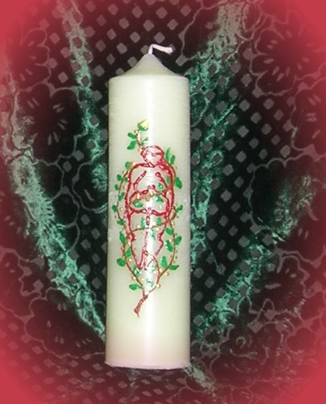 Gerne stelle ich auch Kerzen nach Deinen Wünschen und Vorstellungen her – so ich die künstlerische Möglichkeit habe diese Wünsche umzusetzen. Einfache Darstellungen (1-2 Farben, simple Strichvorzeichnungen) sind relativ gut und zügig umzusetzen. Mehrfarbige und kompliziertere Abbildungen, wie die der Göttin Gaia oder die Slytherin-Kerze, benötigen mehrere Arbeitstage und sind mit entsprechend höherem Aufwand verbunden. Da die Arbeit mit Kerzenpens nicht korrigiert werden kann, kann ich auch im Vorfeld nicht garantieren, das das Motiv am Ende ‚perfekt‘ ist. Aber ich garantiere für gute, konzentrierte Arbeit.
