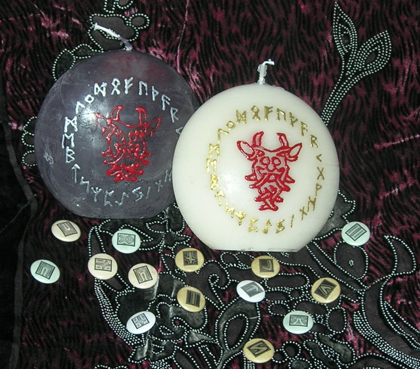 Das Runen-Futhark, in der Mitte die Maske des Runensteins von Aarhus, welcher Freundschaft symbolisiert. Frei nach einem Design von Exo. Diskuskerze, Durchmesser ca. 15 cm.
