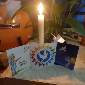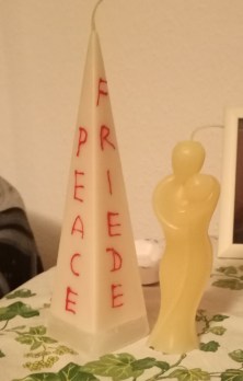 Ich hatte gebeten mir Fotos von eurer Friedensarbeit zuzusenden und zu meiner großen Freude sind verhältnismäßig viele Rückmeldungen gekommen, einige gestatten mir auch ihre Bilder hier zu veröffentlichen. Es ist schön zu sehen wie unterschiedliche rituelle, spirituelle und ungebundene Gruppe und Einzelpersonen sich intensiv mit dem Thema befassen. Sei es durch das Errichten eines Altars, sei es durch magische, kreative Arbeit, sei es durch das Entzünden einer Kerze.