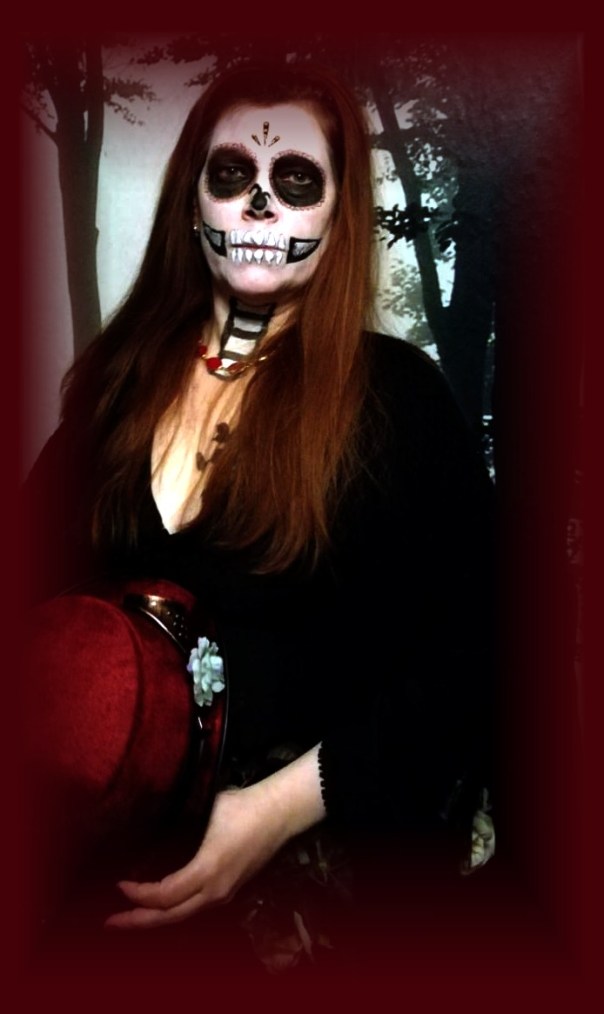 Todesgöttin Hel flüsterte mir ins Ohr und ich dachte daran sie zu personifizieren, doch die Göttin zeigte mit ihrer rechten Hand quer über die Welt nach Süden zu einer Freundin, „sei doch sie“, flüsterte sie und so schälte ich mir das Fleisch von den Knochen und umgab mich mit Rosen. La Catrina kam zu Besuch nach Berlin, bestieg meinen Wagen und fuhr zum vereinbarten Treffpunkt für eine fröhliche Party. Pünktlich klingelte ich an der Tür zum Ort der Feier und war dann gar nicht so überrascht, als meine Freundin Hel mir die Türe öffnete.