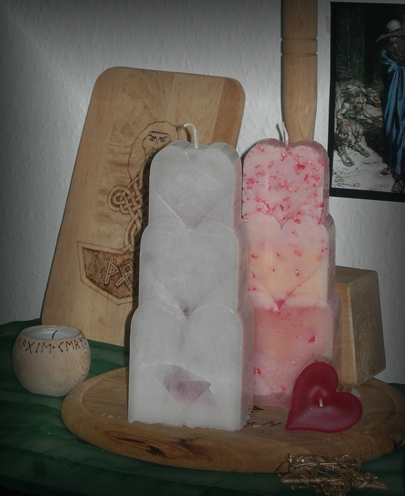 Die Kerze ‚Herzen aus Eis‘ wird individuell angefertigt. Die Anfertigung dauert einen Tag und findet in meiner magischen Umgebung statt. Es besteht die Möglichkeit zwischen unterschiedlichen Düften, die im Inneren der Kerze verborgen sind, zu wählen. Aber natürlich kann man die die Kerze auch ohne Duft erhalten.