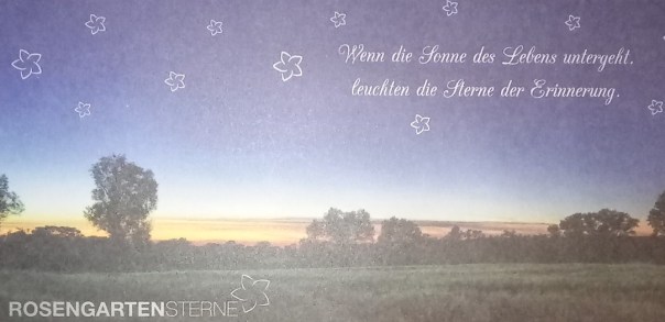 Weiterhin bist Du Teil meines Lebens, von nun an begleitest Du mich als mein Leitstern, auch in der dunkelsten Zeit. Dein Strahlen wird von Tag zu Tag heller und scheint in meinem Herzen sowie am Himmel, Du bist mein Band zu den Sternen, Du bist mein Anker und mein Halt in den anderen Welten.