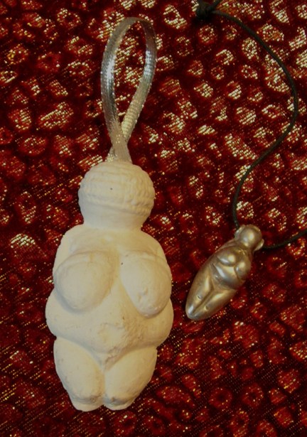 3.) Eine selbst hergestellt Figur aus Gießkeramik mit silbernen Band zum Aufhängen. Die Figur ist ca. 10 cm groß, weiß, und zeigt die Venus von Willendorf.