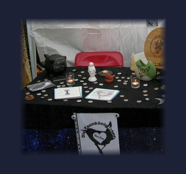 Das Programm der Veranstaltung spiegelt zum einen das bunte, magische Berlin wieder. Zum anderen stellen sich heidnische Gruppen, die ihre Hauptpräsenz in anderen Bundesländern haben, vor. So präsentierte sich aus dem Bereich der Ordensmagie beispielsweise der Berliner Zweig des OTO mit einem kleinen Informationsangebot, während zu den Veranstaltungen der Reclaiming-Gemeinschaft Reclaimer nicht nur aus Berlin, sondern aus ganz Deutschland angereist gekommen sind. Auch aus unserer kleinen Gruppe der Zaunköniginnen waren einige zum Informationsaustausch gekommen.