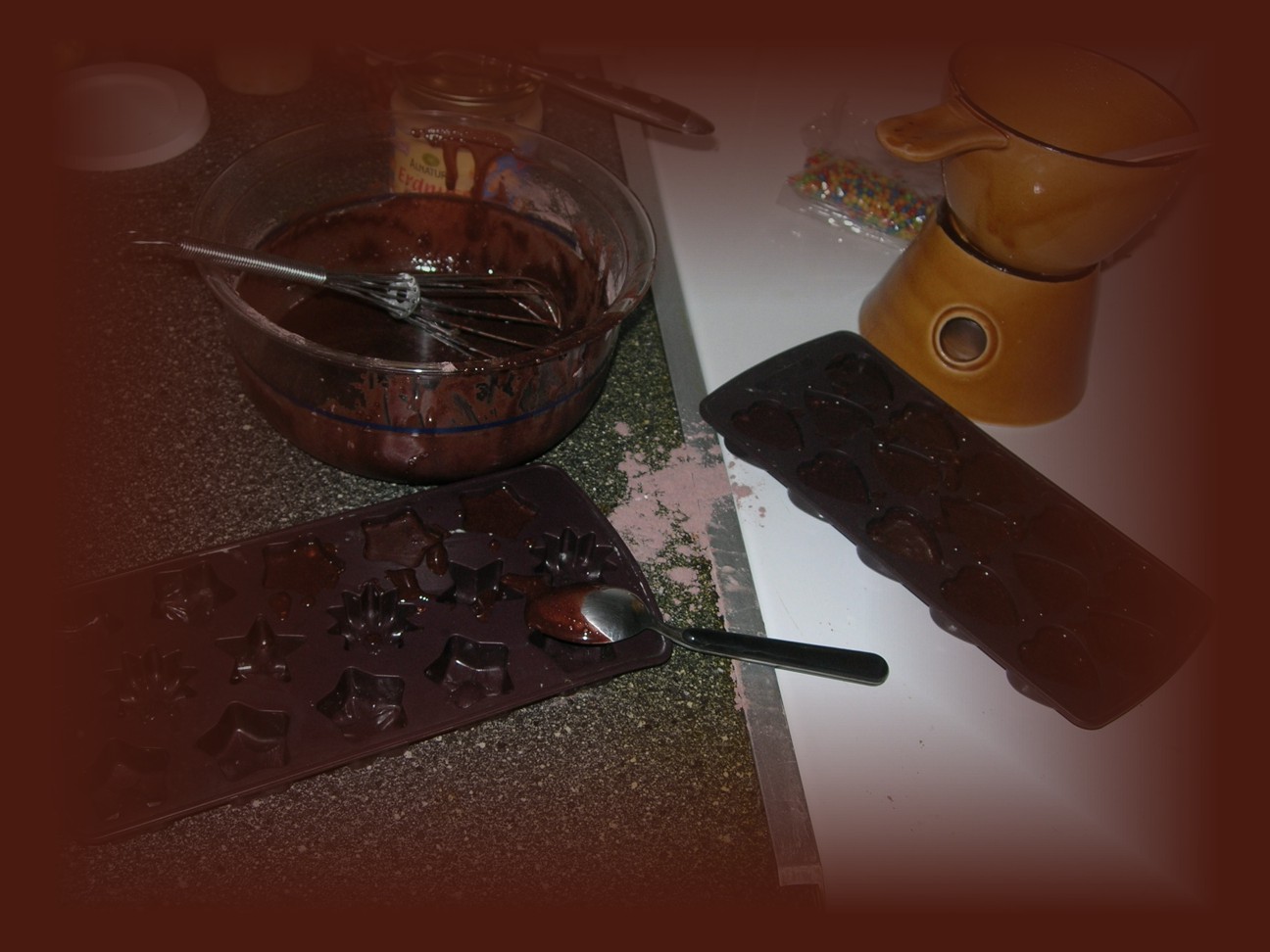 Sobald das Fett flüssig ist wird das vorbereitete Kakao-Zucker-Pulver zügig mit dem Schneebesen unter gerührt. Hierbei sollte sehr sorgfältig gearbeitet werden, damit sich keine Klümpchen bilden. Es sollte eine leicht zähflüssige und glatte Masse entstehen. Diese Masse wird dann in Silikon-Pralinenformen gegossen. Wer so etwas nicht zu Hause hat kann auch normale Eiswürfelformen verwenden. Zum Festigen dann wird die Masse in den Kühlschrank gestellt (nicht in die Tiefkühlung!).