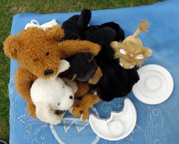 Erst einmal geht die kleine Hexe nicht alleine auf die Konferenz, sondern mit ihrer Kuscheltiergruppe. Und nun muß ich erst einmal schreiben, was es mit dieser Kuscheltiergruppe auf sich hat: Manch‘ eine Hex‘ reist mit ihrem Begleittier (oder mit mehreren dieser Tiere) durch die Welt. Es geht mit ihr durch dick und dünn, durch Land und Luft und sitzt beim Ritual, beim Workshop oder bei der Konferenz stets irgendwo mit dabei. Und irgendwann – es war auf einem dieser magischen Treffen zwischen Hexen – begann jemand die Tiere zu fotografieren, denn sie erlaubten alle bedingungslos im Internet gepostet zu werden. Anhand der Tiere kann man später erkennen welche Hexen und Heiden anwesend waren – wenn man Bescheid weiß. Und so bleiben die begleitenden Hexenmenschen auf Wunsch weitestgehend anonym. Eine schöne Idee.